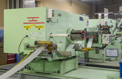 倍于后續工藝中實際使用寬度的帶材上電鍍,然后由熟知電鍍材料切割工業的人員切割分條,可以如同復制般同時得到多卷材料。