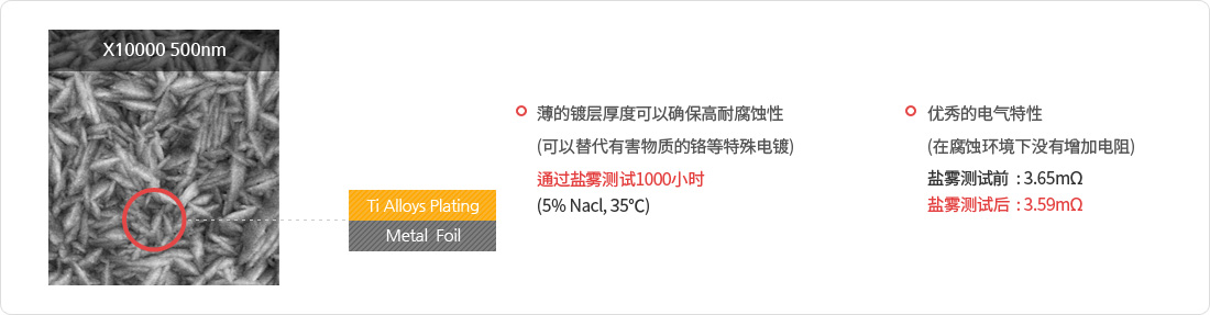 隨著產(chǎn)業(yè)高度化增加空氣污染和腐蝕環(huán)境惡化,同時(shí)環(huán)保政策的出現(xiàn)來加速成長電動(dòng)汽車市場,需要具備優(yōu)秀電氣特性和高耐腐蝕性的材料的開發(fā)。因此,錦華隆開發(fā)成功鈦合金電鍍技術(shù),這個(gè)技術(shù)超越了在產(chǎn)業(yè)廣泛使用的鍍鎳的有限性。